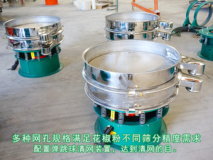 花椒粉不銹鋼振動篩可篩分0.028mm-10mm不同規格尺寸的花椒粉,過網率高篩分精度可達95%,同時還配置彈跳球清網裝置,在篩分過程中不停撞擊篩網,達到清網的目的可有效解決篩分過程中篩網堵塞影響篩分效率的問題。