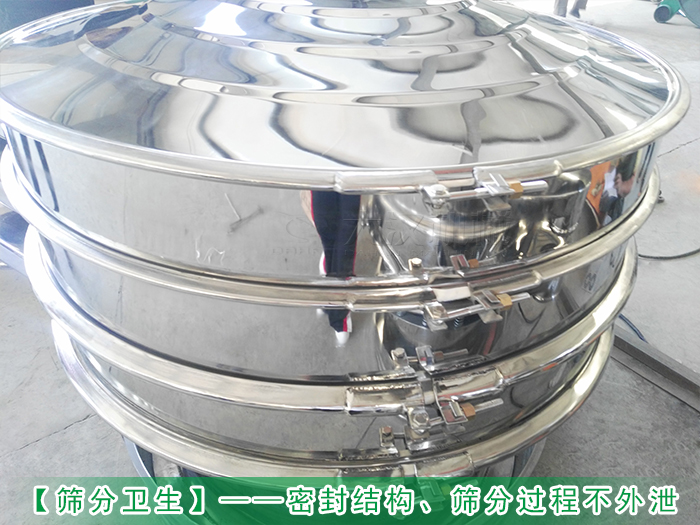 不銹鋼振動篩整機采用密閉式結構,可以避免物料在篩分過程中溢散,防止浪費物料的同時還對現場環境造成污染,上部分進料口處加裝有防塵蓋、篩框與篩網之間有密封膠圈、軟連接等進行隔離和密封,防止灰塵進入混入物料中不會受到污染,所采用的密封件均為硅膠材質符合食品行業的篩分要求。