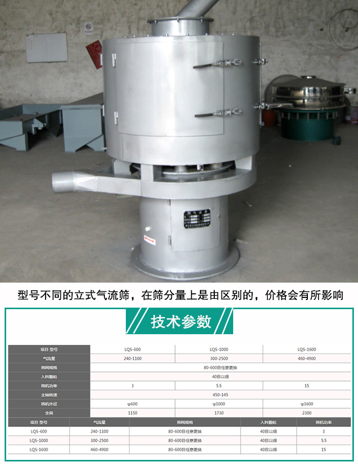 型號不同的立式氣流篩,在篩分量上是由區別的,價格會有所影響。大漢立式氣流篩型號有LQS-600型、LQS-1000型、LQS-1600型等,不同型號的立式氣流篩,其氣流量、電機功率、篩機外徑等都是不同的,所以價格自然也是不同的。
